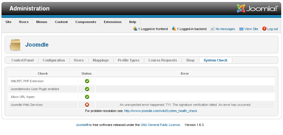 I think I configured everything allrigt. I have a test unit in a windows XP machine using WAMP server. Moodle and Joomla run fine separately. Installing the joomdle components in both moodle and joomla parts gives no problems. But in the end, at the final system check, I got this message: