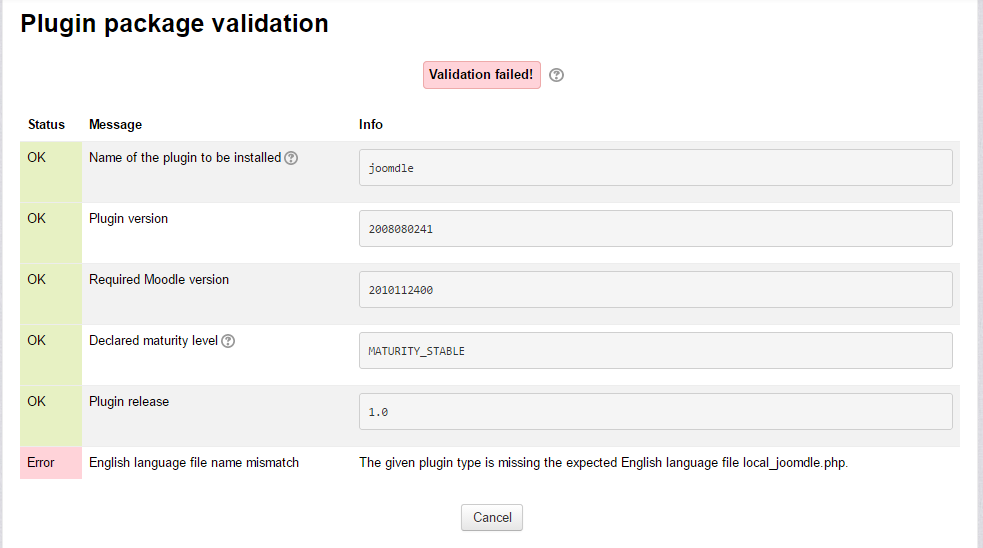 I'm following the instructions to install this, but the plugin doesn't even work. Moodle says it is missing an english language file local_joomdle.php.