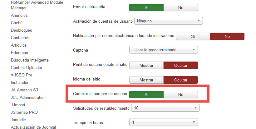 Buenos días, en joomla se tiene activa la opción para permitir el cambio de nombre de usuario.