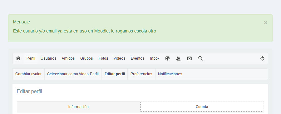 Cuando un usuario ingresa al sistema y va a la página de su perfil e intenta cambiar su nombre de usuario se genera el siguiente mensaje.