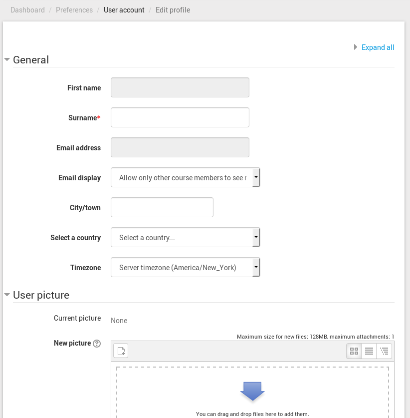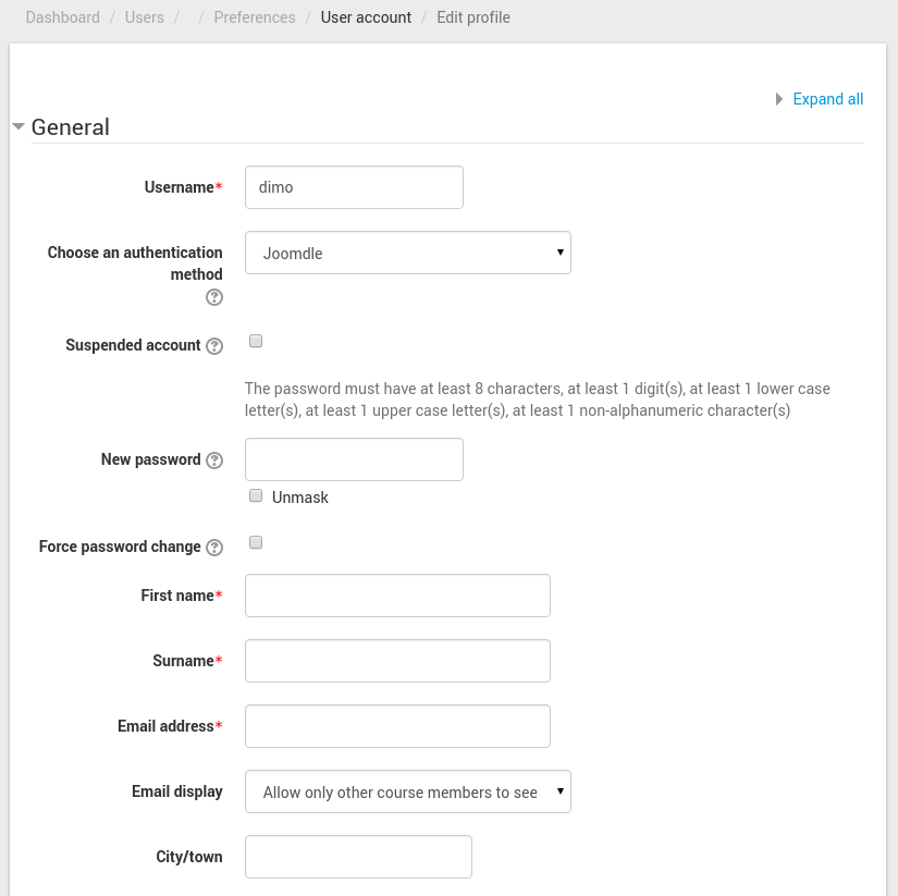 5. In moodle we have a profile with correctly mapped username and password, but the other required fields are empty