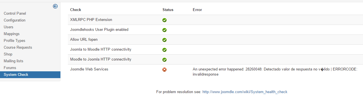 Hoy estaba instalando la extension para la venta de cursos, me dio con verificar el estado del sistema y me encontre con este errror: An unexpected error happened: 28260048: Detectado valor de respuesta no v�lido | ERRORCODE: invalidresponse