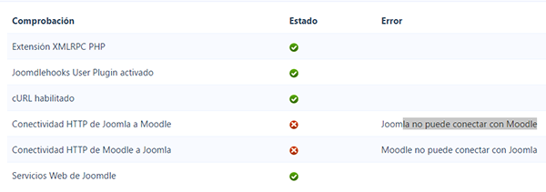 Por último: estas comprobaciones son de ayuda para diagnosticar problemas, por lo que Joomdle debería funcionar. Lo único que puede que falle por el mismo motivo es la autenticación única.