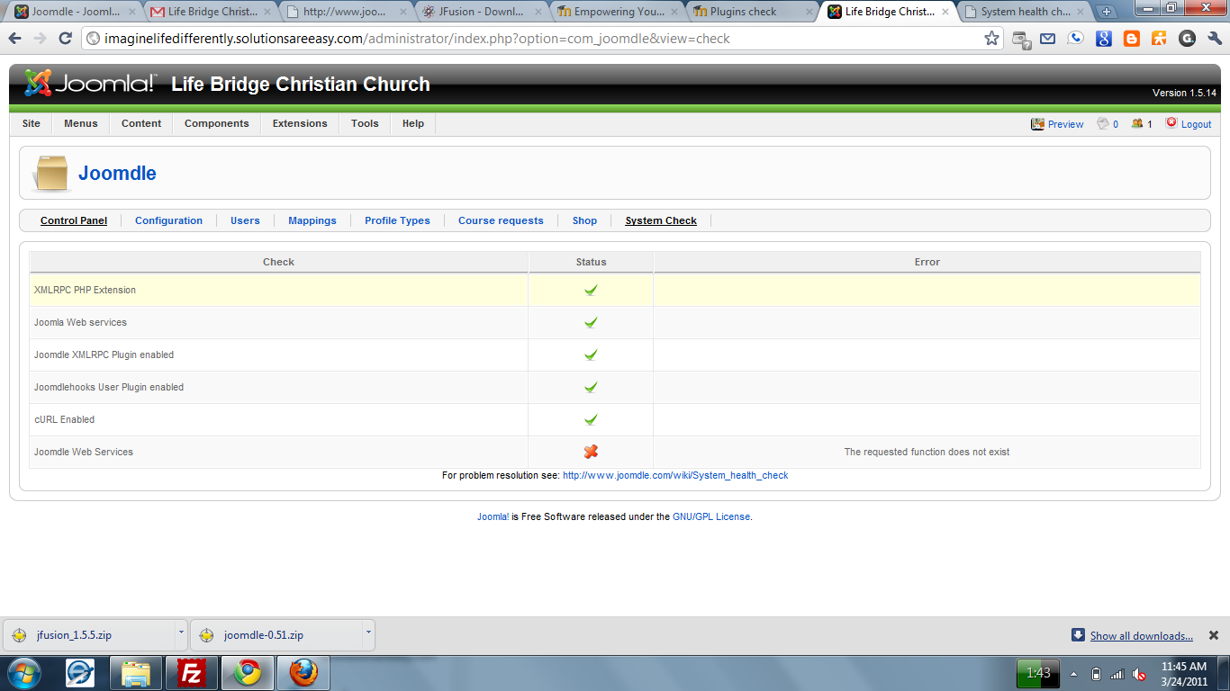 After installation of Moodle 2.0+ and Joomla 1.5.14 and following the installation instructions for Joomdle, I ran the system check. It came back with the following error under the Joomdle Web Services section: The requested function does not exist. I tried both connection types and the error remains the same.