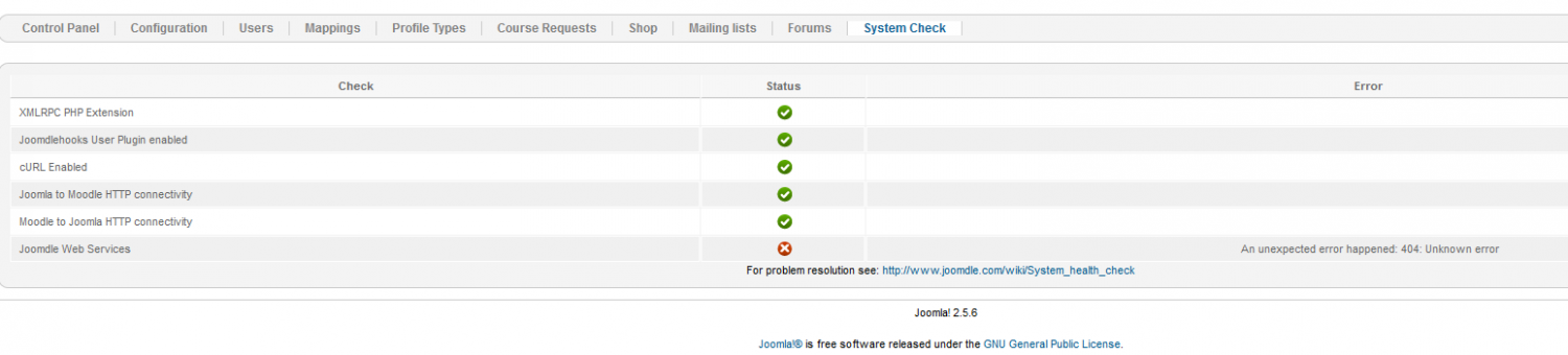 The problem is that i am getting the error in Joomdle system check as Joomdle web services - An unexpected error happened: 404: Unknown error
