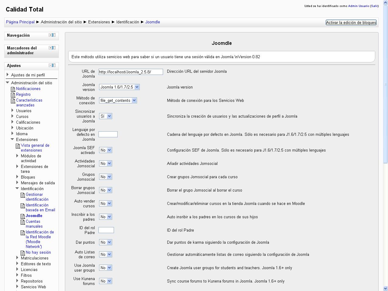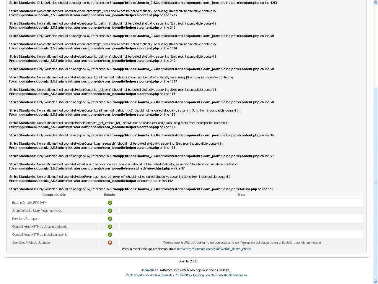 Bueno, sigamos, ahora voy al Joomla e instalo el plugin de Joomdle, se conecta al Moodle ya que me muestra la cuenta "Joomdle" pero me sale una lista enorme de avisos tipo "Strict Standards" que no sé lo que es y al final de todo me dice que "Parece que la URL de Joomla no es correcta en la configuración del plugin de autenticación Joomdle en Moodle" cuando les prometo que la URL está bien escrita.