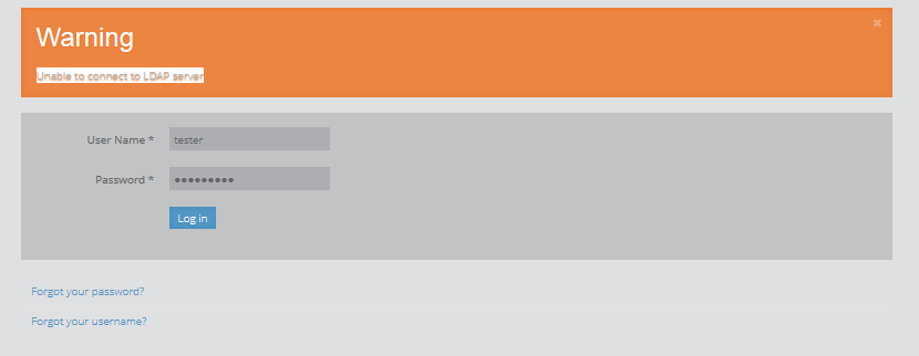 When I try to log in, the screen rejects the login with an error message: Warning. Unable to connect to LDAP server.