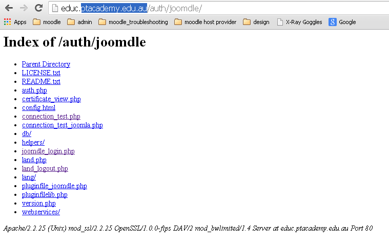 joomdle was working perfectly until yesterday, i tried to login from joomla and normally it will take me to moodle home page embeded in joomla site. Instead,a list of the files in the authentication plugin listed(i attached a screenshot).