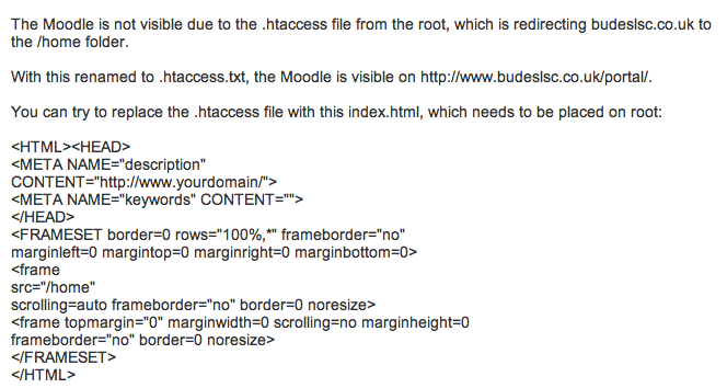 Good. As per above, it did seem like a redirection / .htaccess problem. I am not sure about creating the index.html file however as when you want to run joomla (index.php) it will not be picked up. Perhaps I have forgotten something about where your joomla is installed.