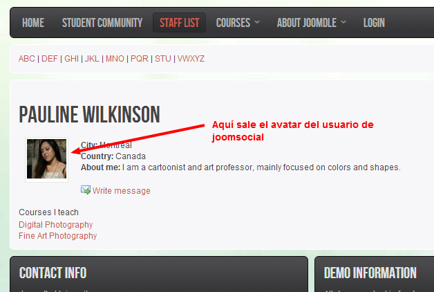 Hola tengo un problema cuando hago clic en el menú de listas de profesores desde joomla figura el avatar por defecto pero yo quiero que se muestre el avatar de usuario de joomsocial como se ve en la demo de vosotros: