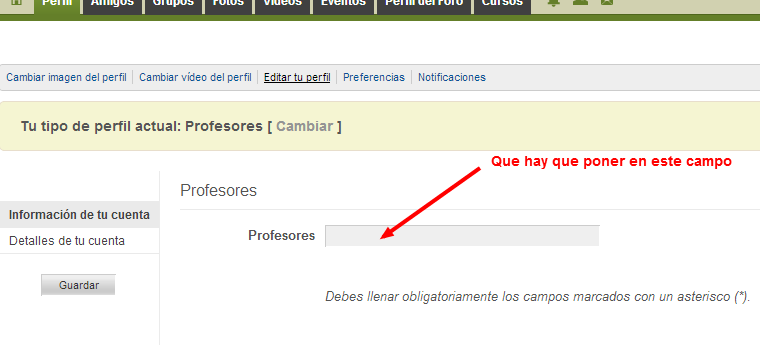 Pero luego al editar mi perfil me da la opcion de cambiarlo a Alumnos o Profesores y me sale un campo para llenar