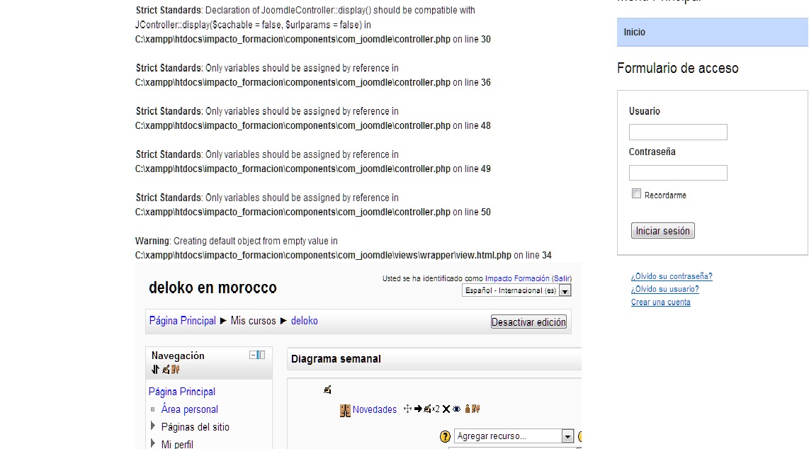 Pese a eso puedo ver los usuarios, cursos, calendario... etc de moodle en joomla. Pero en joomla me sale una serie de errores terribles que luego se ven reflejados en la web... los errores son :
