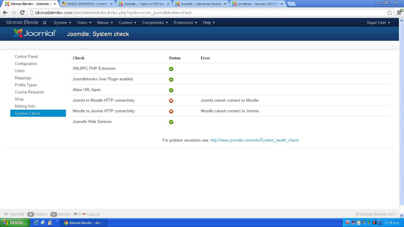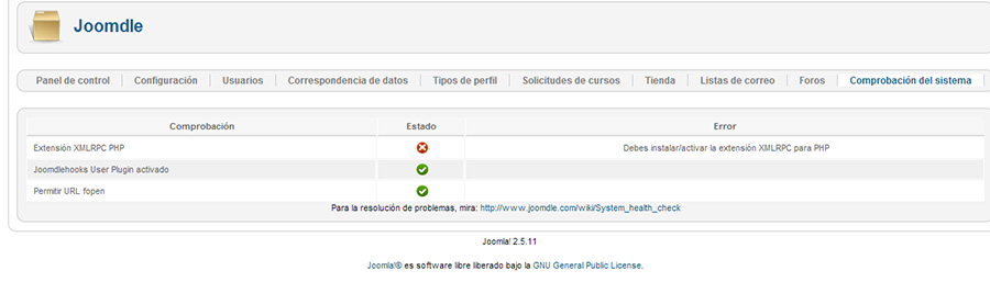 todo parece ir correctamente pero al iniciar sesión en joomla me sale el siguiente error Fatal error: Call to undefined function xmlrpc_encode_request() in /mnt/web9/d0/83/53706883/htdocs/joomla_01/administrator/components/com_joomdle/helpers/content.php on line 72 y si refresco cambia este mensaje "Token inválido" Cuando hago la comprobación del sistema de jommdle me encuentro con