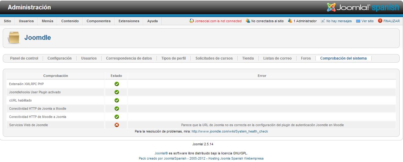 - De los 6 aspectos que revisa la Comprobación del Sistema en el componente Joomdle, se marcan los 5 primeros pero no el último, el de los Servicios Web de Joomdle como lo muestro en la imagen anexa.