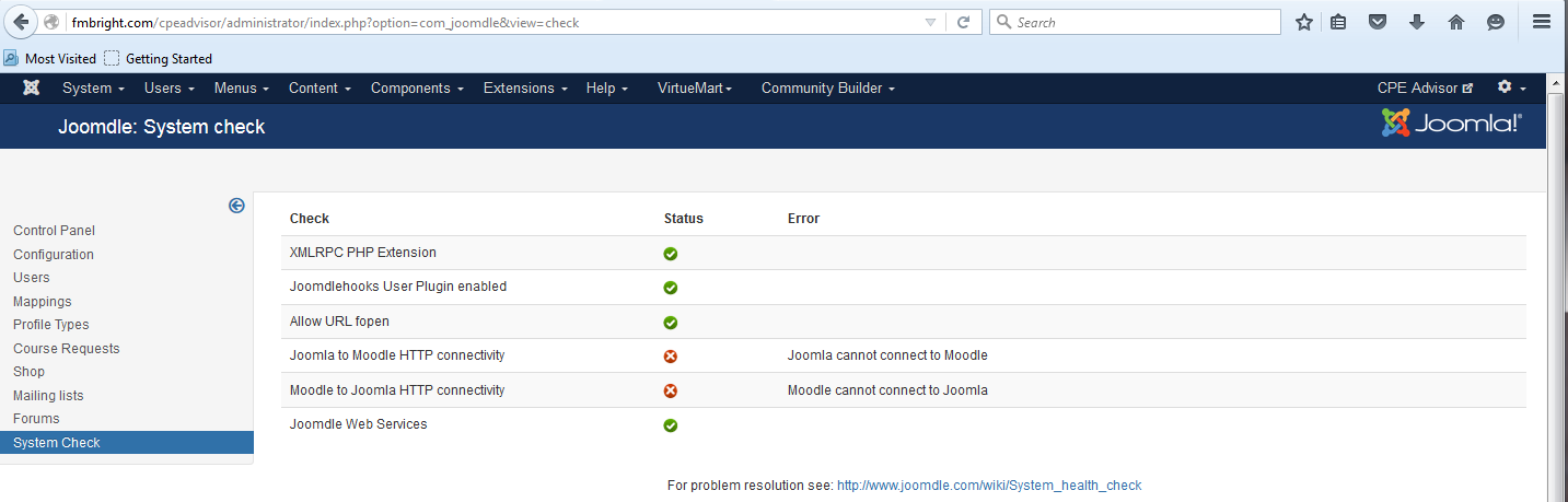 I am using Community Builder Login to register a user. I receive the error "XML-RPC Error (404): Unknown error" after saving the registration. The System Checks says the status for Joomla to Moddle and Moodle to Joomla are both red. But the Joomdle Web Service status is green. From other posts, this should be ok.