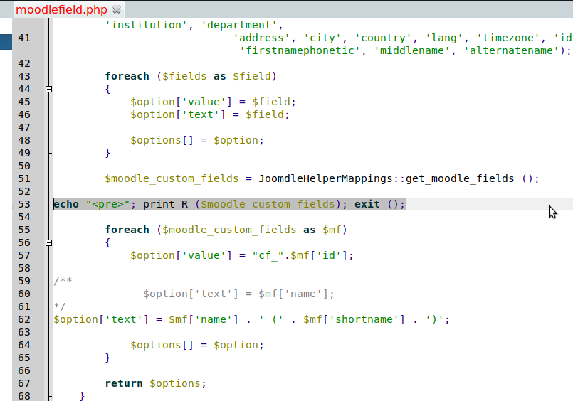I've attached a screen shot of the code mods you gave me for moodlefield.php, and also a screenshot of the results: "shortname" is empty for every element of the array.