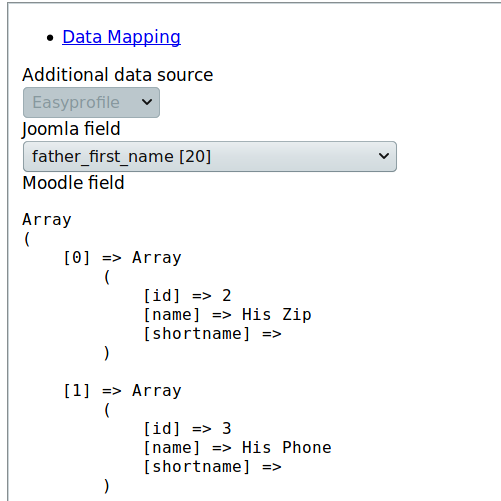 We would like the ability to select the Joomla aliases and associated Moodle shortnames instead of name labels when mapping field data. I noticed that internal field names are visible for the Moodle "default" profile fields, but not for the extended, custom user profile fields in Moodle. It would be important to see both Joomla aliases and Moodle shortnames in the dropdown mapping lists with the same searchability that you have now.