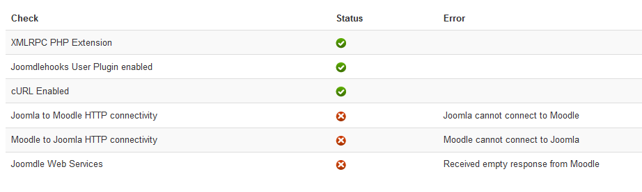 As I told you before: there seems to be a general problem connectin from Joomla to Moodle, as all checks fail. Try disabling firewall and test.